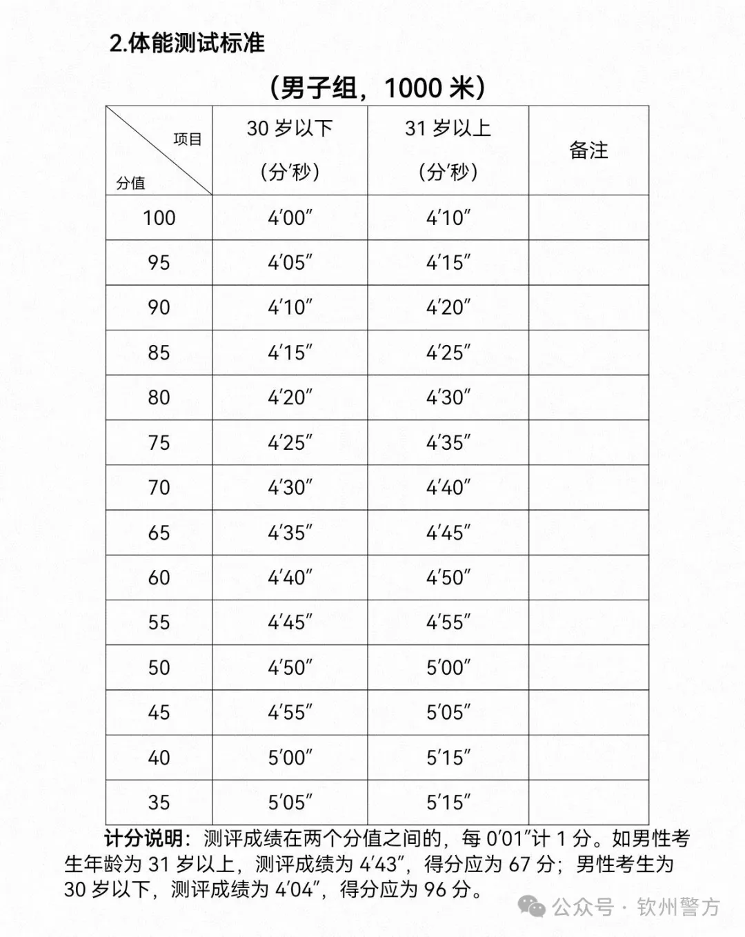 1.体能测试。资格审查合格的考生参加体能测试。体能测试项目为长跑,即男子1000米,女子800米体能测试计算成绩,评分标准附后。