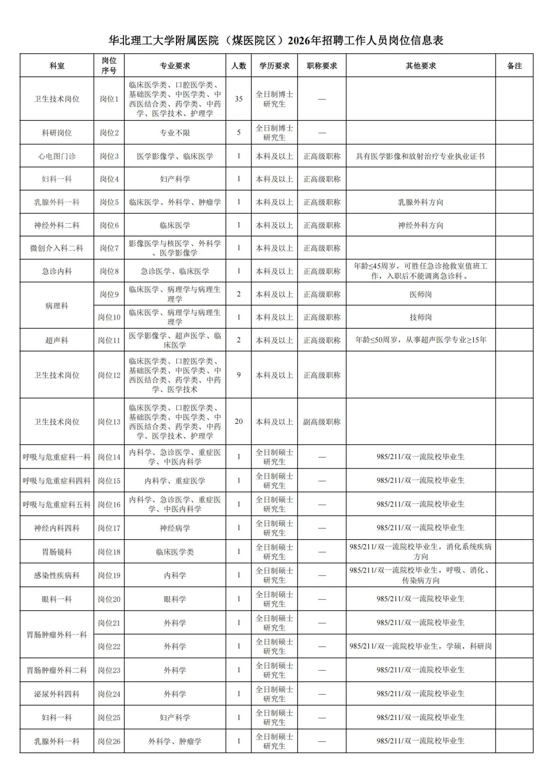 附件1:华北理工大学附属医院(煤医院区)2026年招聘工作人员岗位信息表.pdf (103 KB)