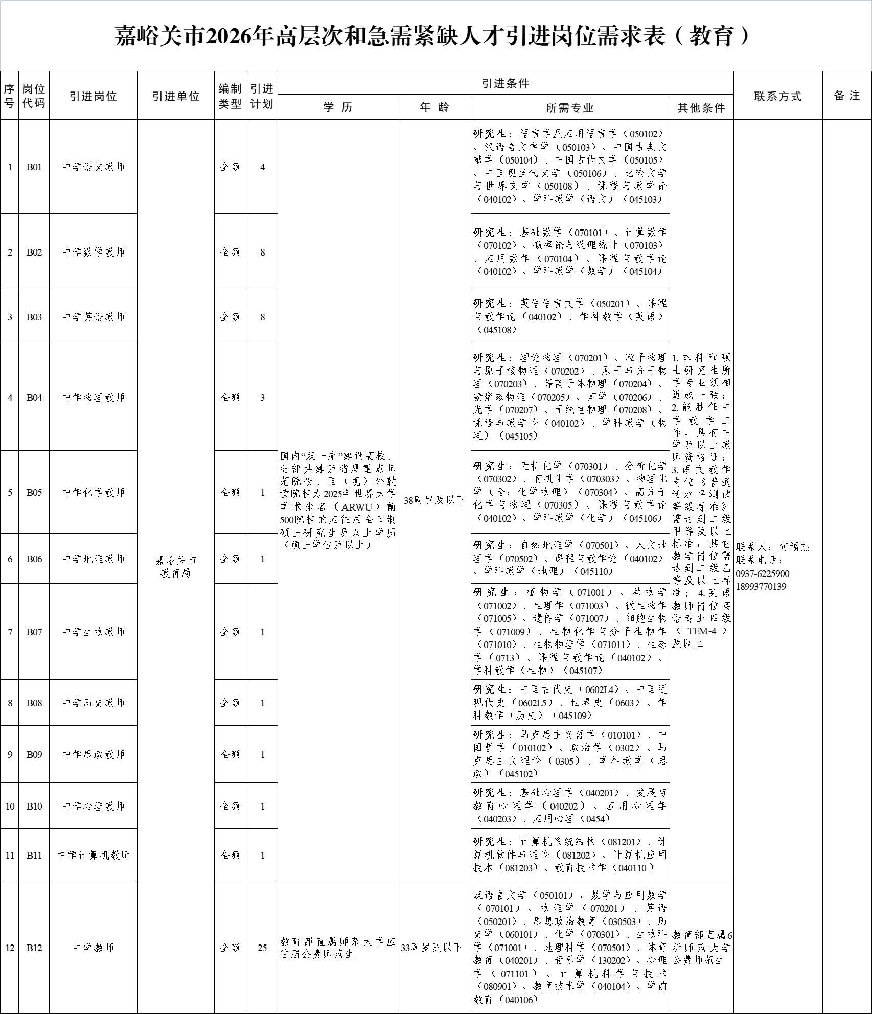 附件:嘉峪关市2026年高层次和急需紧缺人才引进岗位需求表(请查看下图或识别下方二维码)
