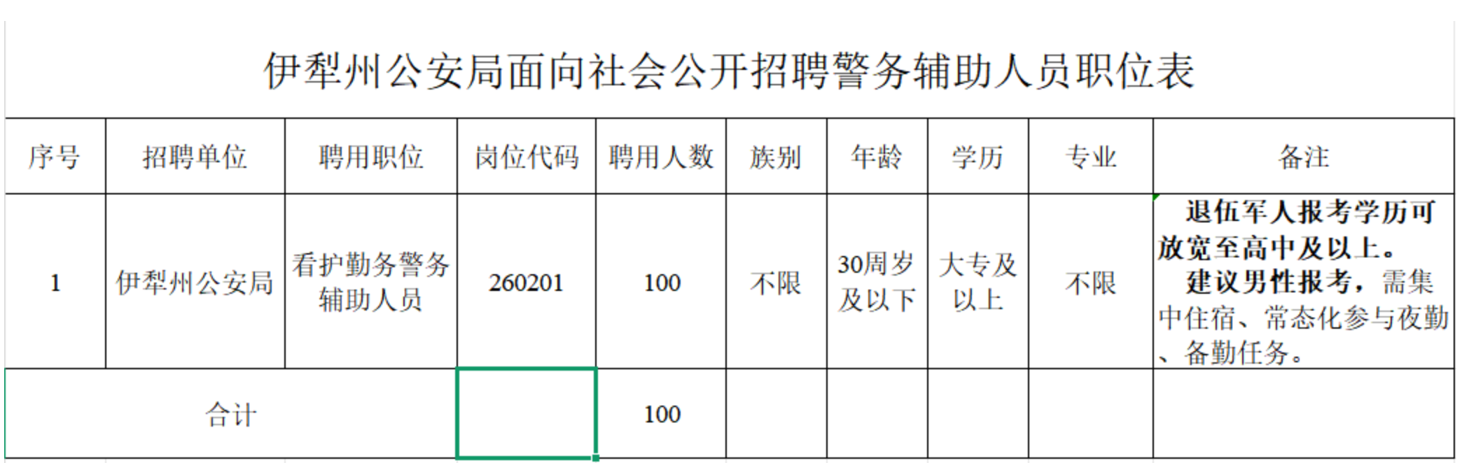 根据《中华人民共和国监察法》《新疆维吾尔自治区公安机关警务辅助人员招聘办法》等相关规定,新疆伊犁州公安局现面向社会公开招聘100名警务辅助人员,主要负责看护勤务工作。现就有关事项公告如下: