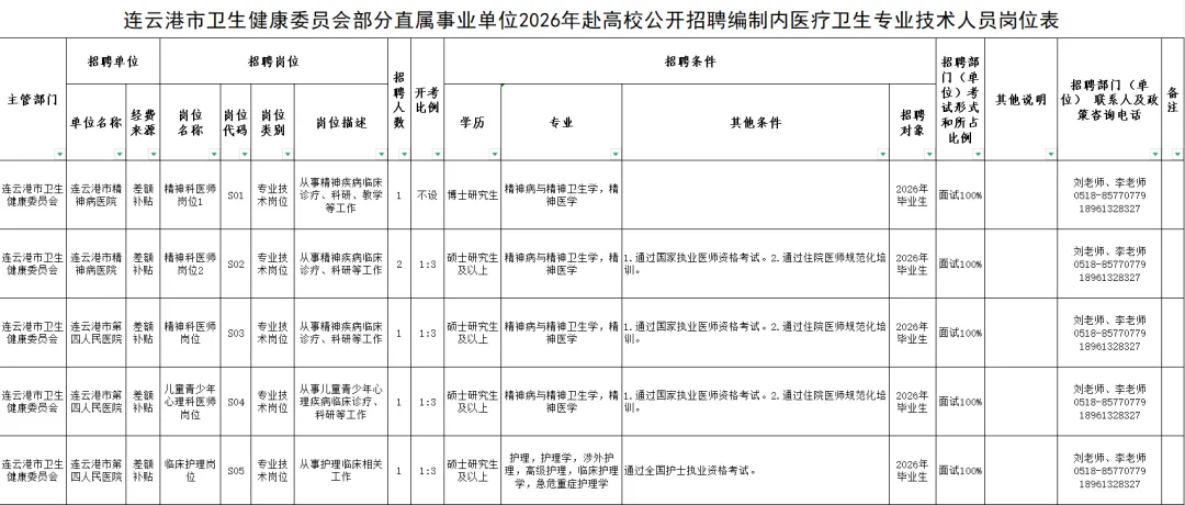 具体岗位详见附件《连云港市第四人民医院、连云港市精神病医院2026年赴高校公开招聘编制内高层次人才岗位表》。《岗位表》也可在连云港市人力资源和社会保障网(http://rsj.lyg.gov.cn)、连云港市卫生健康委员会网站(http://wjw.lyg.gov.cn)查询、下载。请注意,连云港市精神病医院和连云港市第四人民医院为同一家单位。