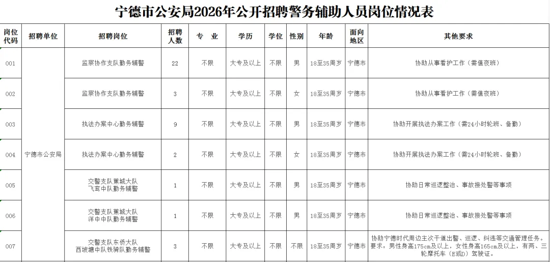 原标题:宁德市公安局2026年第一季度公开招聘警务辅助人员公告