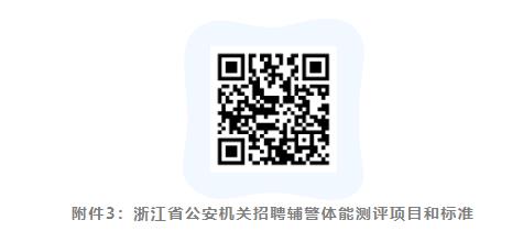 报名人员资格复审通过后进入体能测试环节。报名巡特警大队应急处突岗位体能测试项目为引体向上、立定跳远、100米、1000米,四项总成绩达到220分为合格,其他岗位体能测试项目为10*4往返跑和纵跳摸高(均不超过2次),标准详见《浙江省公安机关招聘辅警体能测评项目和标准》(附件3)。体能测试合格人员进入下一环节。测试期间如因个人身体问题引发意外,由考生自行负责。