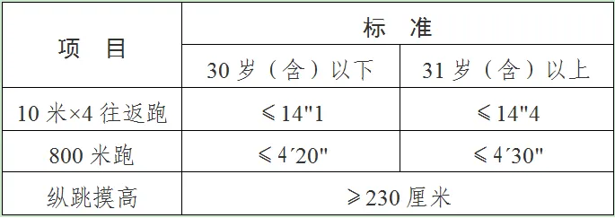 2.体能测试内容:体能测试标准参照《公安机关录用人民警察体能测评项目和标准》的通知文件执行。