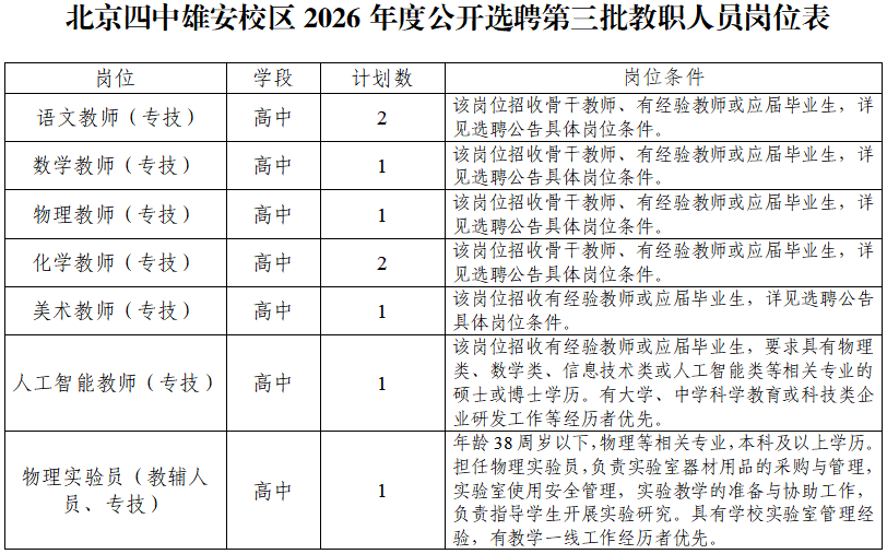 原标题:北京四中雄安校区2026年度公开选聘第三批教职人员公告
