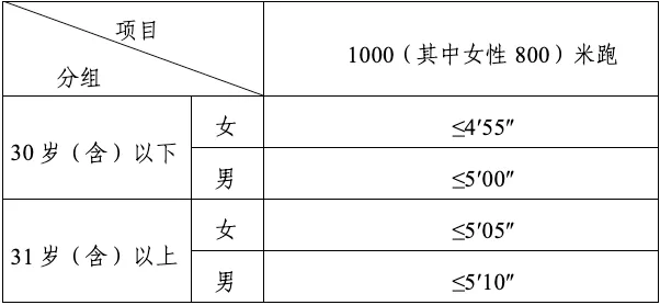 1995年4月1日(含)以后出生的考生,执行30岁(含)以下体能测试标准;1995年3月31日(含)以前出生的考生,执行31岁(含)以上体能测试标准。