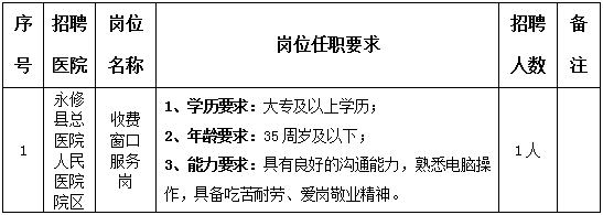 因永修县总医院工作需要,决定面向社会公开招聘1名编外合同制工作人员,现将有关事项公告如下: