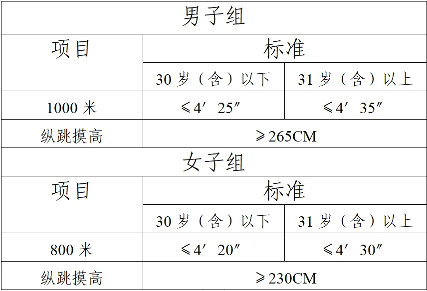 体测项目为纵跳摸高和1000米(男)或800米(女)长跑,相关标准参照《公安机关录用人民警察体能测评项目和标准》。体能测试有一项不合格的,取消进入下一环节资格。
