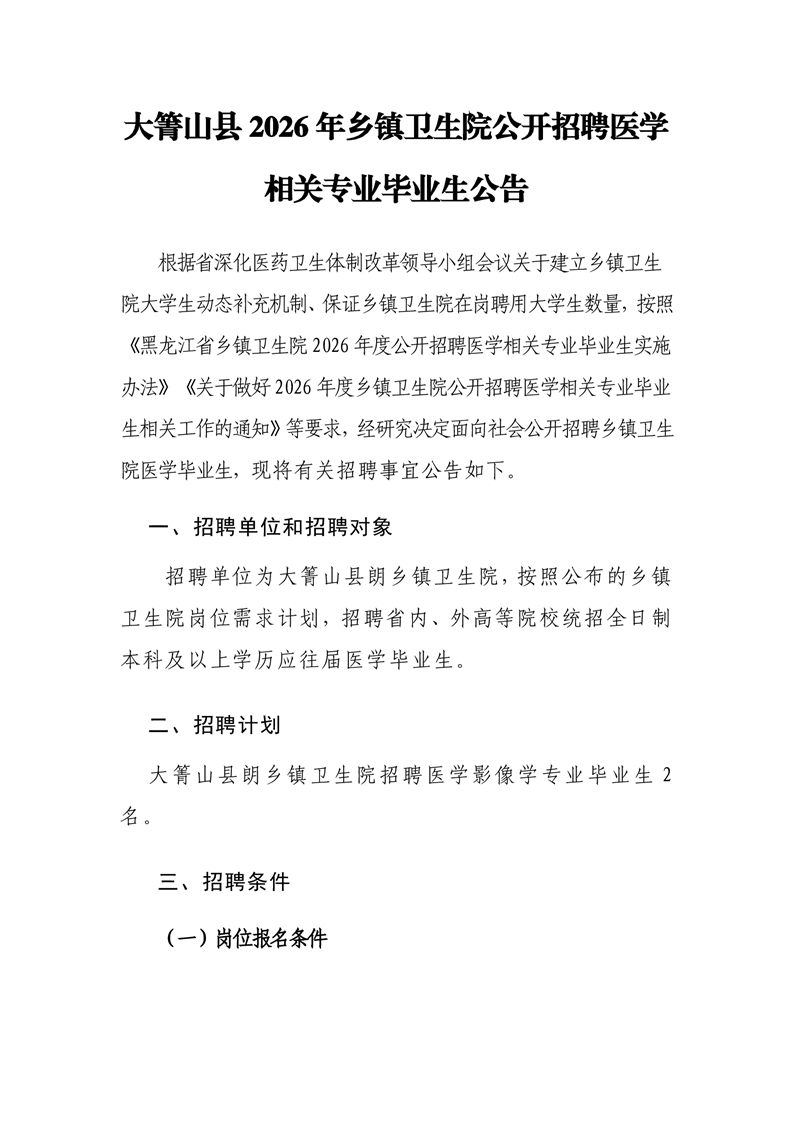 原始标题:大箐山县2026年乡镇卫生院公开招聘医学相关专业毕业生公告