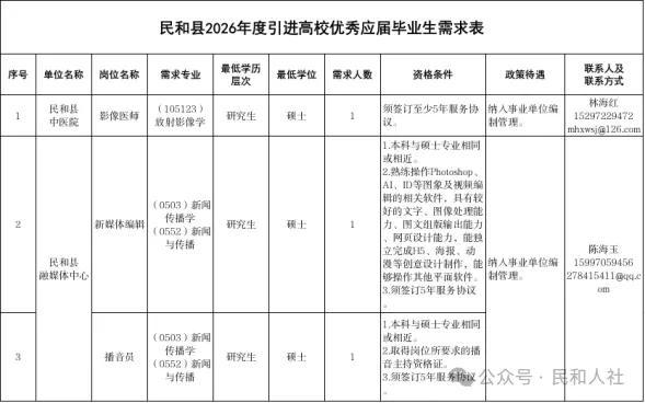 原始标题:民和县2026年度校园引才公告