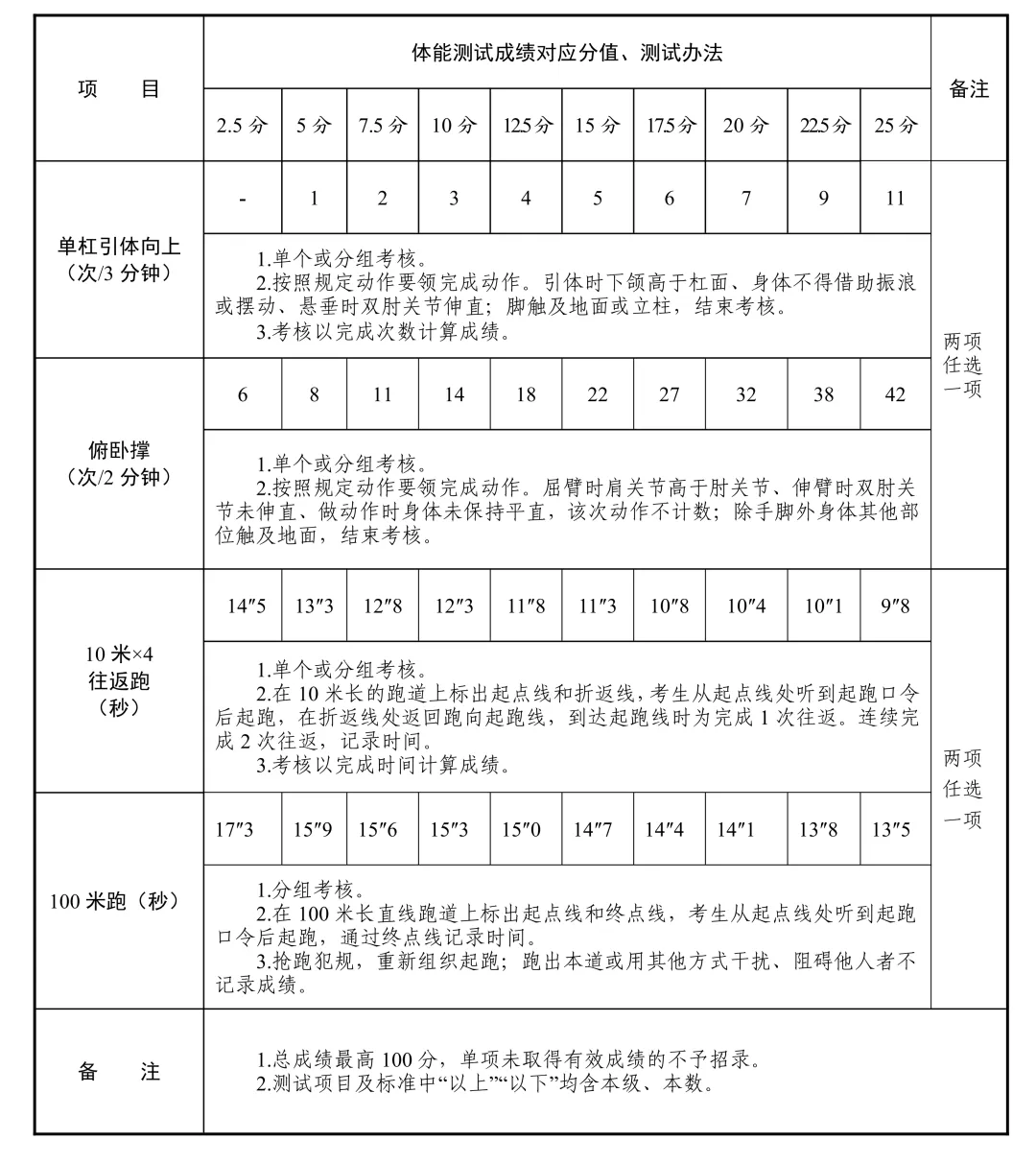 体能测试:主要包括1000米跑、原地跳高和立定跳远二选一、单杠引体向上和俯卧撑二选一、10米×4和100米跑二选一,考核项目标准见附件3。单项未取得有效成绩的,不合格。