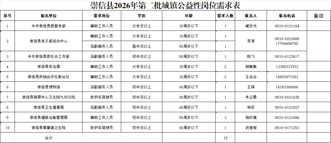 原始标题:崇信县2026年第二批城镇公益性岗位招聘公告