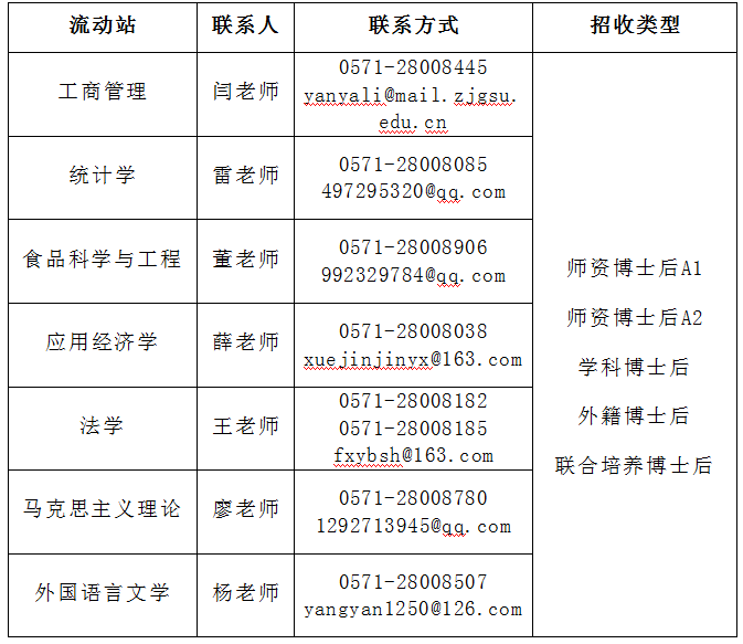 备注:各类型博士后待遇可咨询对应流动站联系人