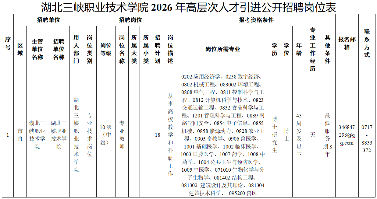 本次人才引进计划数共18个(2026年全年引才计划数20个,已完成招聘2个),具体条件详见附表《湖北三峡职业技术学院2026年高层次人才引进公开招聘岗位表》(以下简称《岗位表》)。