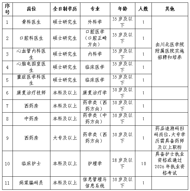面试名单在医院官方网站公布,面试时间、地点通过招聘系统及短信进行通知,请及时关注。1-5号医生岗位将由川北医学院附属医院实施招聘,具体时间及流程安排另行通知。