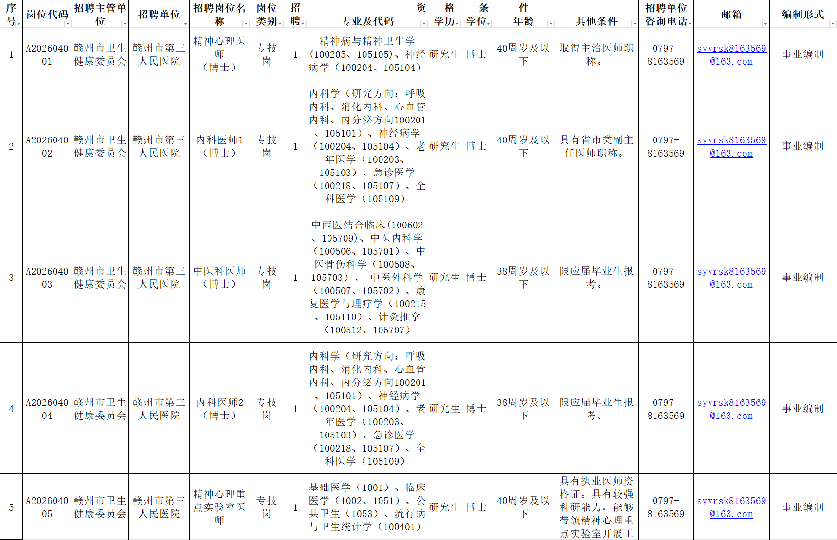本次招聘计划共5名,具体招聘岗位及要求详见《赣州市第三人民医院2026年公开招聘高层次人才岗位表》(附件1)。