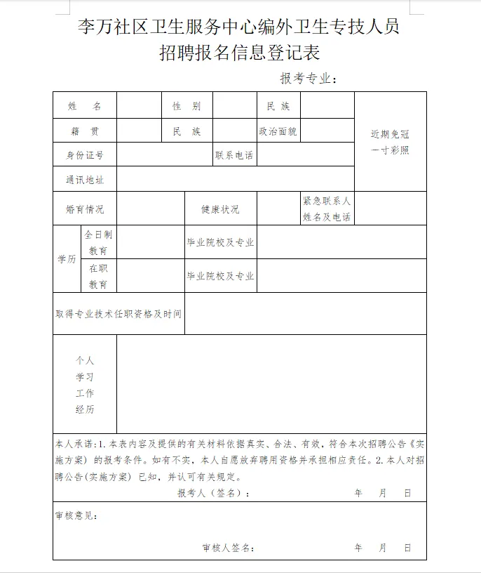 应聘者持报名表(见附件)、身份证、毕业证、执业资格证及相关工作证明等原件、复印件,到李万社区卫生服务中心(地点:竹林路106号)一楼放射科报名。