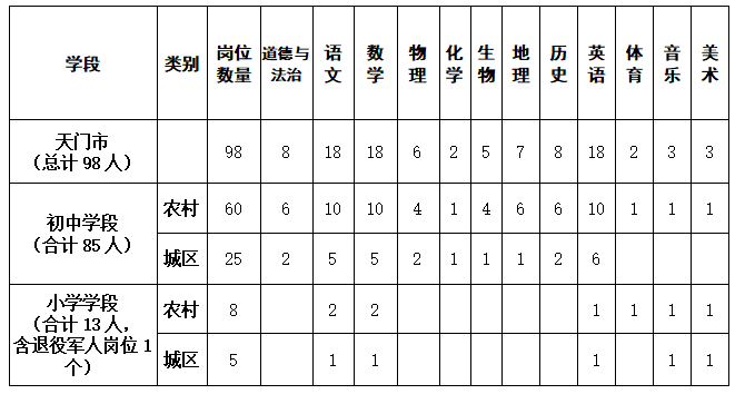 根据中小学编制、岗位空缺情况及教育教学需要,2026年天门市共面向社会公开招聘98名中小学教师,其中初中教师85名(农村初中教师60名、城区初中教师25名),小学教师13名(农村小学教师8名,城区小学教师5名),其中1个农村小学数学教师岗位为面向退役军人招聘岗位,具体岗位如下: