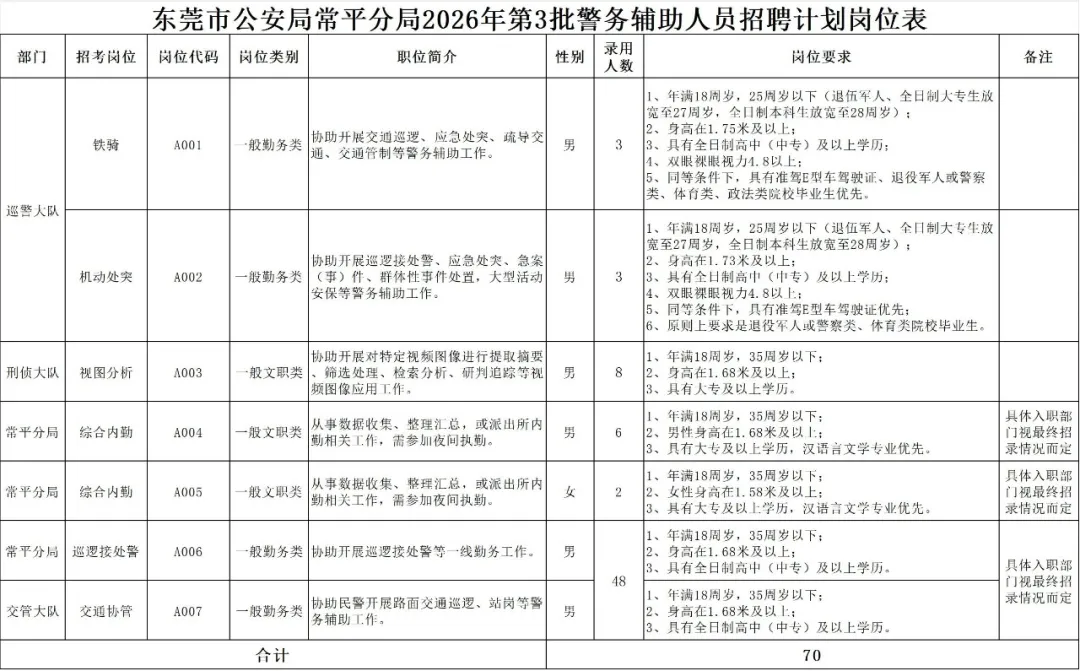 本次招聘人员为履行《广东省公安机关警务辅助人员管理办法》规定的辅助性警务职责的人员,不具有人民警察身份。招聘人员工作地点在东莞市(日常在常平镇),工作时间根据任务安排确定,需服从管理,能接受常态化体能训练、紧急召回、24小时值班备勤、轮值夜班、节假日值班、离莞出差、一线执勤、岗位调配等安排。本次招聘共设置6个岗位,计划招聘70人,具体招聘岗位、人数、资格条件等详见《东莞市公安局常平分局2026年第3批警务辅助人员招聘计划岗位表》(附件1)。