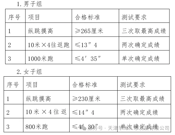 体能测评按照规定的标准和程序进行,体能测评采取单项淘汰方式进行,凡一项不达标的视为体能测评不合格。体能测评不合格的或未按要求参加体能测评的人员,不能进入面试;通过体能测评的人员,按照进入面试人数与计划招聘人数3:1的比例,从到低分的顺序,确定进入面试人员名单。达不到比例的,按照实际人数进入面试。笔试成绩相同的,一同进入面试。