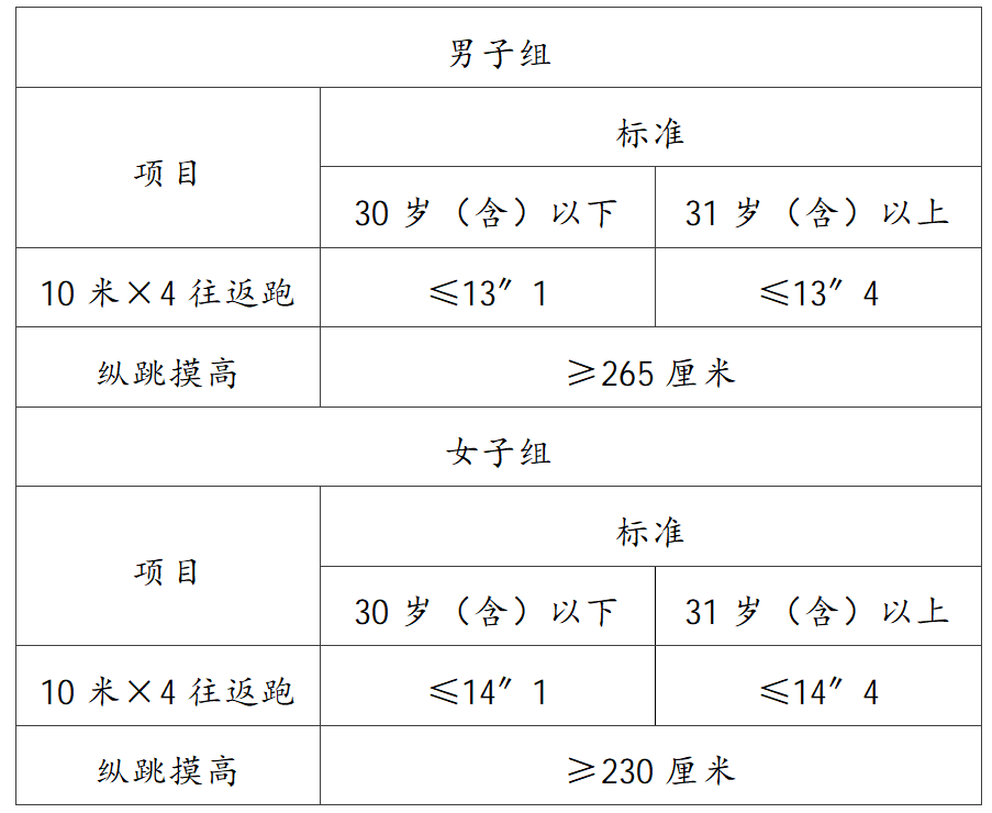 体能测评项目为纵跳摸高和10米×4往返跑,相关标准参照《公安机关录用人民警察体能测评项目和标准》执行。年龄计算时间截止到参加体能测评当月。
