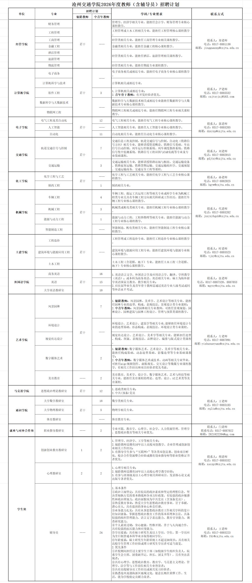 见附件3:沧州交通学院2026年度教师(含辅导员)招聘计划及联系方式。