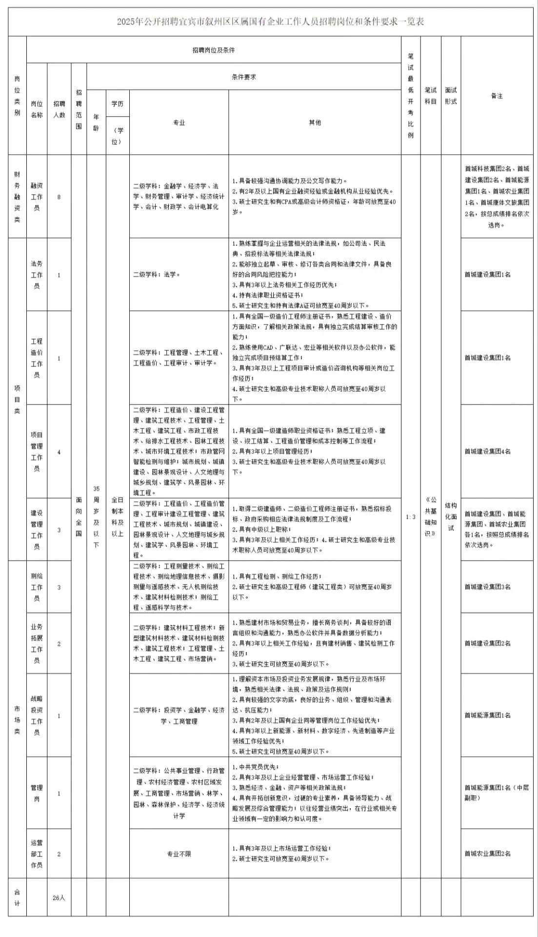 附件:1.2025年公开招聘宜宾市叙州区区属国有企业工作人员招聘岗位和条件要求一览表