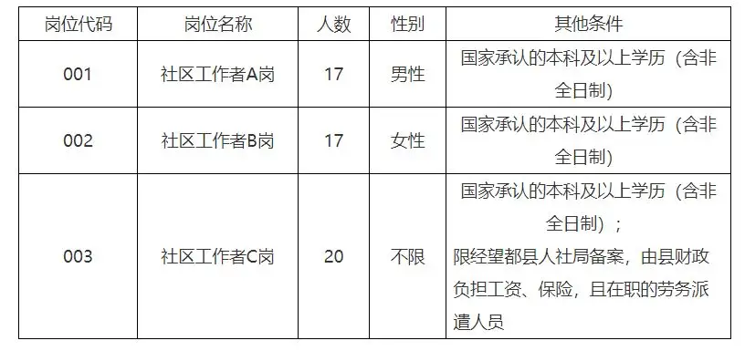 本次公开招聘社区工作者54名(不列编制)。设A、B、C三类岗位。